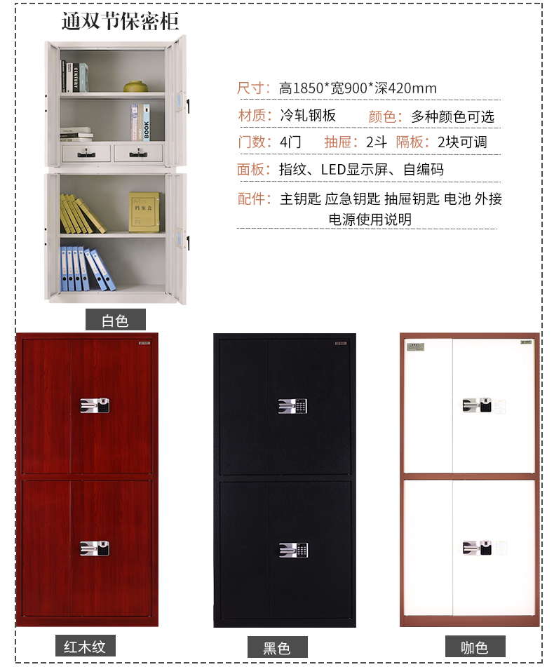 1、密碼文件柜:規(guī)格:H1850*W900*D420 2、產(chǎn)品說(shuō)明:按錯(cuò)密碼三次自動(dòng)報(bào)警5分鐘,人為破壞自動(dòng)報(bào)警5分鐘,2組密碼1-8位隨意設(shè)置,全鋼板結(jié)構(gòu) 。產(chǎn)品配置:內(nèi)配置二塊活動(dòng)層板可上下隨意調(diào)動(dòng),電路版1塊已按裝,應(yīng)急鑰匙1把用于忘記密碼和柜內(nèi)無(wú)電情況下使用,注意:應(yīng)急鑰匙要和主鑰匙分開(kāi)保管,因?yàn)閼?yīng)急鑰匙和主鑰匙同時(shí)使用不需要密碼就能打開(kāi)。電池4粒,注意經(jīng)常檢查電量,如電量不足時(shí),要急時(shí)更換,以免打不開(kāi),外接電池盒1個(gè)在內(nèi)部無(wú)電量時(shí)使用,說(shuō)明書(shū)1本說(shuō)明怎樣使用和設(shè)置自已的密碼,保修卡1張。 3、采用優(yōu)質(zhì)加厚鋼板,內(nèi)外表面磷化噴塑,內(nèi)藏式不易被撬門(mén)三方向多點(diǎn)鎖定,不易被撬,適用于地方:需要存放保密文件和包裹的單位和個(gè)人等等適用到此柜。 3、產(chǎn)品保養(yǎng): 1、放置:適宜放在干燥的地方。 2、清潔:如果表面有灰塵,使布擦干凈即可,不易清潔部分可先用牙膏涂抹后再清潔。