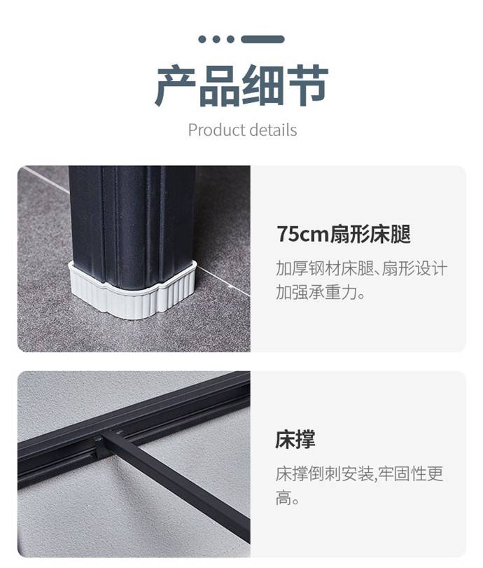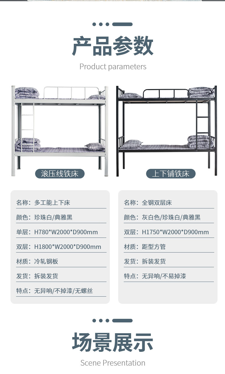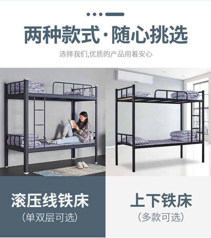 1、上下鋪鐵床:常規(guī)規(guī)格:H1750*W2000*D 900 mm ,可訂做。
